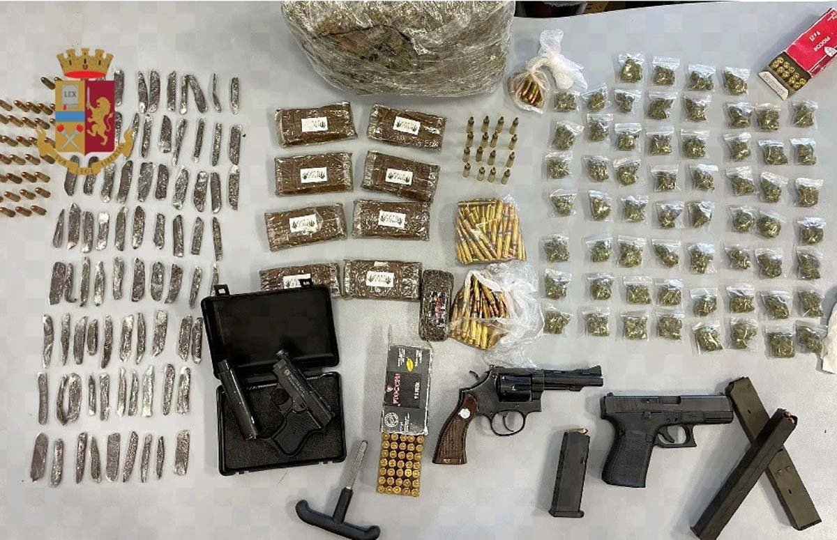 Ancora, gli agenti hanno rinvenuto altre 213 cartucce di vario calibro, un ordigno artigianale, costituito da un barattolo di vetro chiuso con tappo sigillato da nastro adesivo e completo di miccia allacciata ad un dispositivo di accensione elettronico, 60 bustine contenenti circa 100 grammi di marijuana, una busta con circa 550 grammi della stessa sostanza, 79 stecche di hashish del peso di circa 165 grammi e 9 panetti della stessa sostanza del peso di circa 900 grammi.
