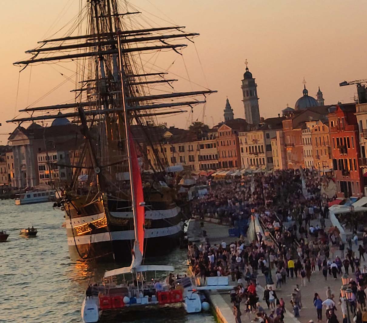 L’episodio è avvenuto davanti a centinaia di persone che stavano aspettando di visitare la nave della Marina. A provocarlo, il catamarano Venice Cat, imbarcazione che offre serate musicali e di intrattenimento per turisti e residenti nel cuore della laguna di Venezia.