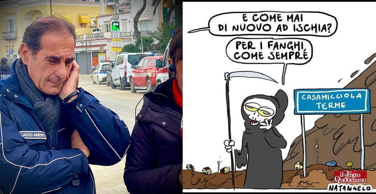Mi riferisco a una vignetta pubblicata dal vignettista del Fatto Quotidiano, Natangelo, che ritraendo la ‘morte’ presso Casamicciola Terme asserisce che ‘è tornata a Ischia per via dei fanghi, come sempre’. La satira deve far riflettere, si dirà. Bene, io davvero ci ho riflettuto e trovo questa vignetta offensiva.