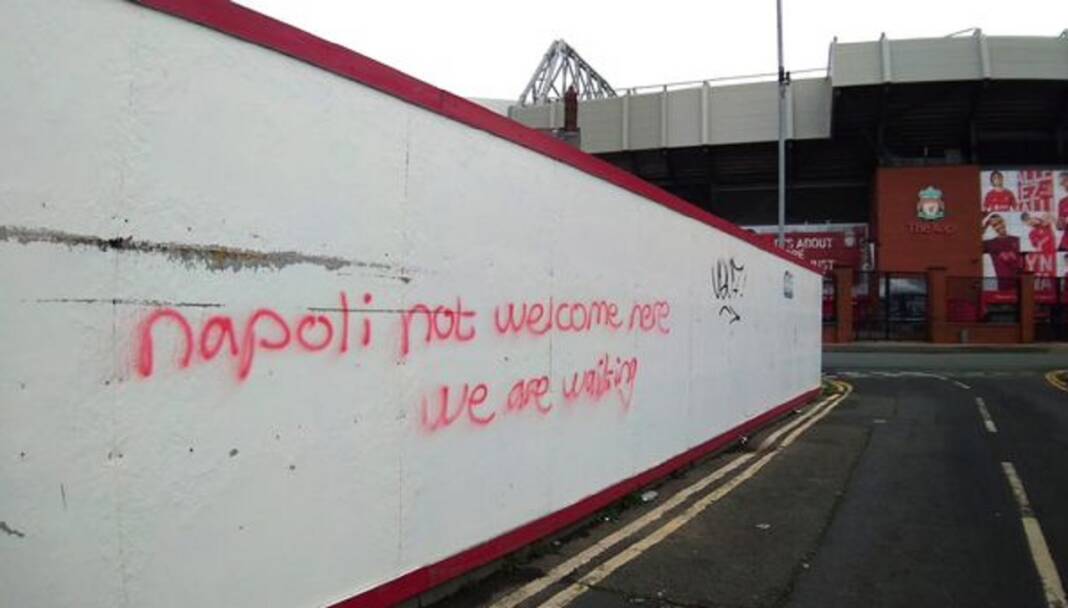 Tra i graffiti, scritti in lingua inglese, si leggono le parole “Scappa Napoli Scappa”, “Napoli ratti” e “Napoli non è benvenuta qui, vi stiamo aspettando”, il tutto su una parete adiacente all’entrata dell’iconica curva Kop di Anfield.
