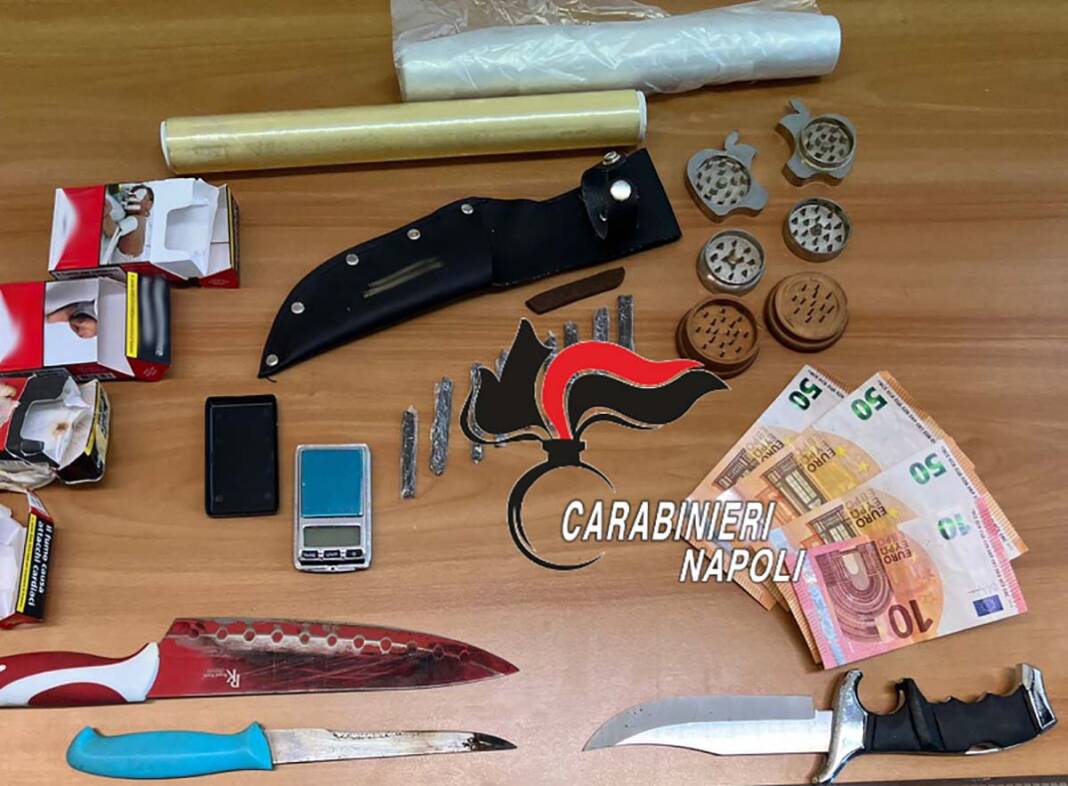 Durante le ricerche sono stati rinvenuti e sequestrati 13 grammi di hashish già suddivisi in dosi e pronte alla vendita, 2 coltelli con la lama ancora intrisa di sostanza stupefacente, 1 pugnale e 160 euro in contanti ritenuti provento del reato.