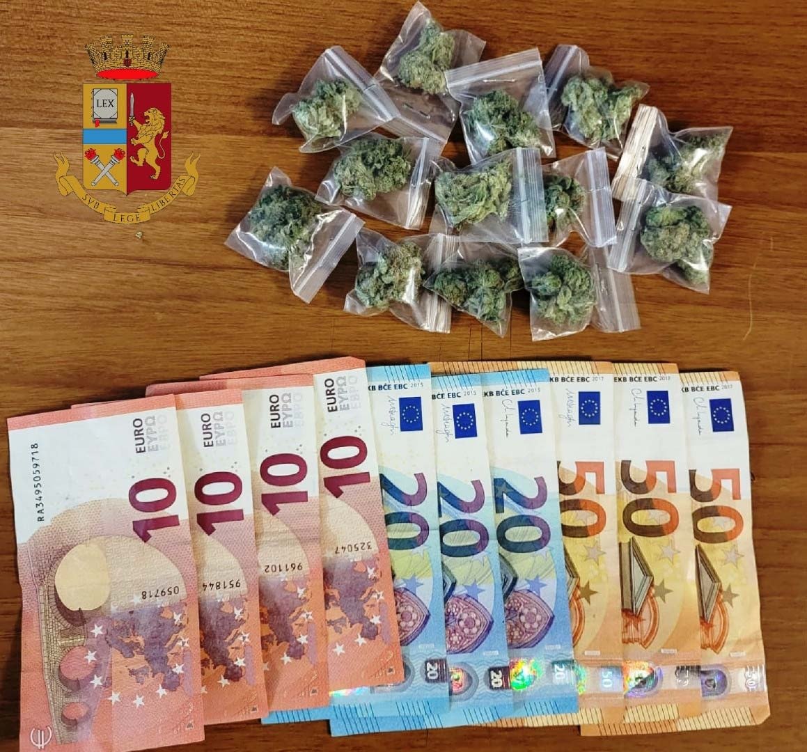 I poliziotti lo hanno raggiunto e bloccato trovandolo in possesso di 13 bustine contenenti circa 16 grammi di marijuana e 250 euro.