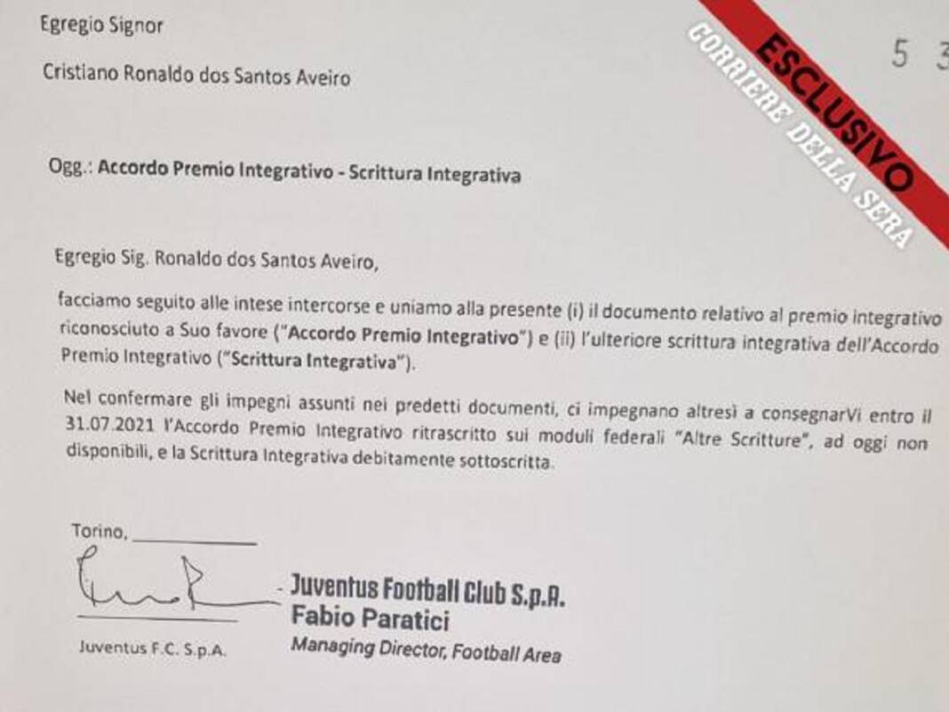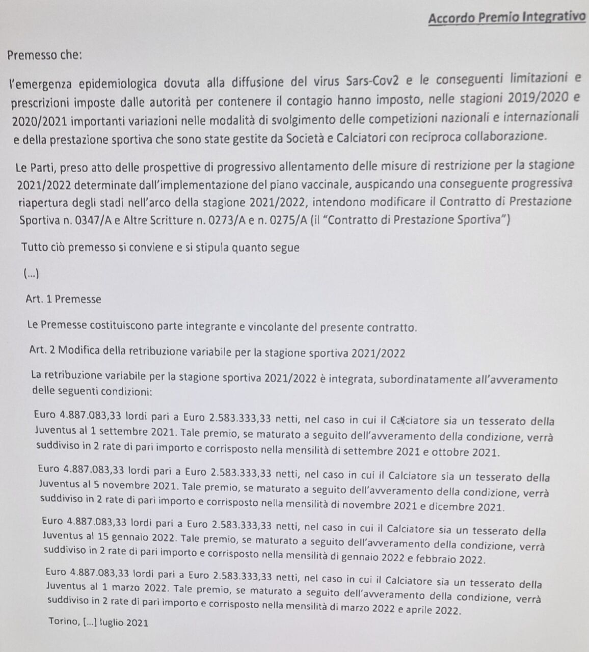 “Egregio Signor Cristiano Ronaldo dos Santos Aveiro”, si legge nella nota, “facciamo seguito alle intese intercorse e uniamo alla presente il documento relativo al premio integrativo riconosciuto a suo favore (Accordo Premio Integrativo) e l’ulteriore scrittura integrativa dell’Accordo Premio Integrativo (“Scrittura integrativa”)”.