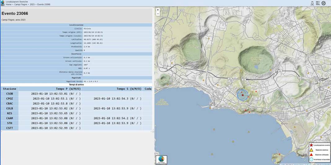 La scossa terremoto con coordinate geografiche (lat, lon) 40.8280, 14.1400 si è verificata ad una profondità di 3 km. Una nuova scosaa ma di magnitudo 1.1 è stata registrata alle 17,52 con con coordinate geografiche (lat, lon) 40.8260, 14.1420 ad una profondità di 2 km.