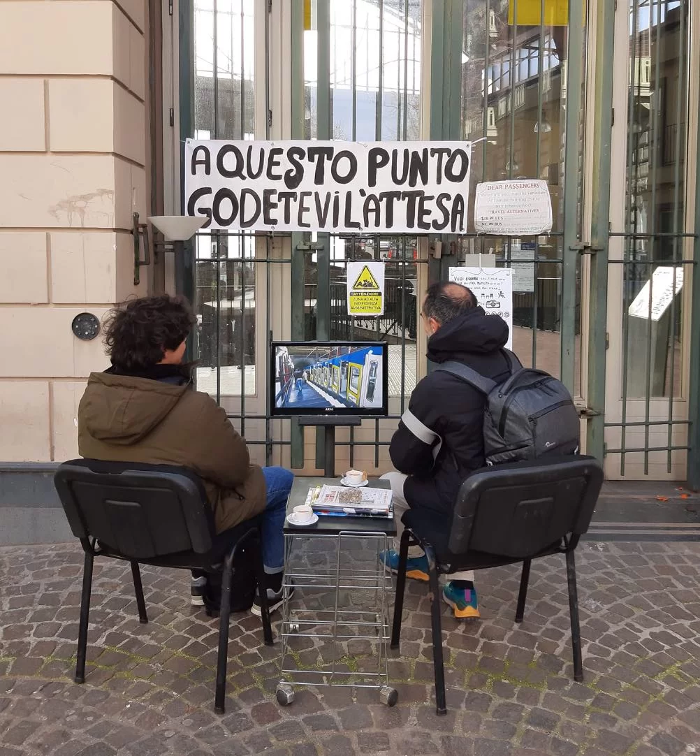 Il Maestro di arte civica Ruben D’Agostino ha installato una confortevole sala d’attesa: sedie, tavolino, caffè, settimana enigmistica e TV accesa su quello che sembra essere l’incrocio fra un film di storia ed uno di fantascienza: la funicolare che funziona.