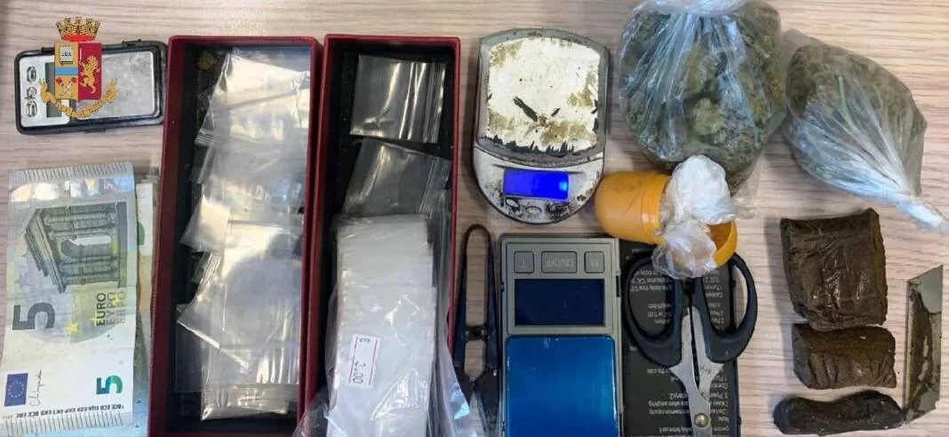 I poliziotti hanno raggiunto e bloccato lo spacciatore trovandolo in possesso di 80 euro; inoltre, hanno rinvenuto presso la sua abitazione una busta contenente circa 34,5 grammi di marijuana, tre pezzi di hashish del peso di circa 65,5 grammi, due involucri contenenti circa 5,7 grammi di cocaina, tre bilancini e diverso materiale per il confezionamento della droga.