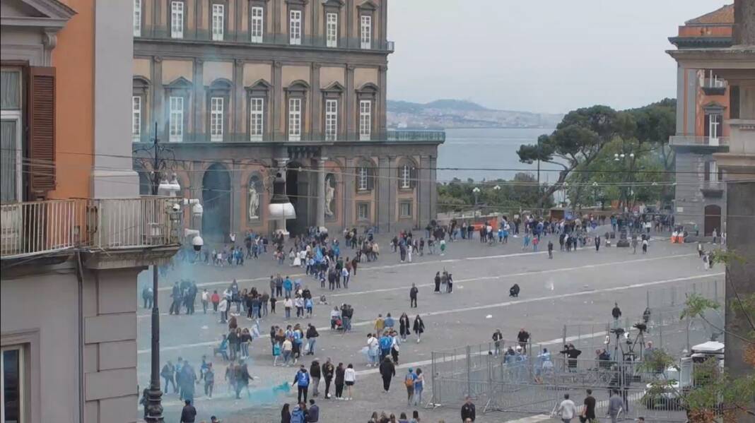 In migliaia si erano radunati sin da stamattina in piazza del Plebiscito, per seguire insieme la partita tra Napoli e Salernitana e festeggiare lo scudetto.