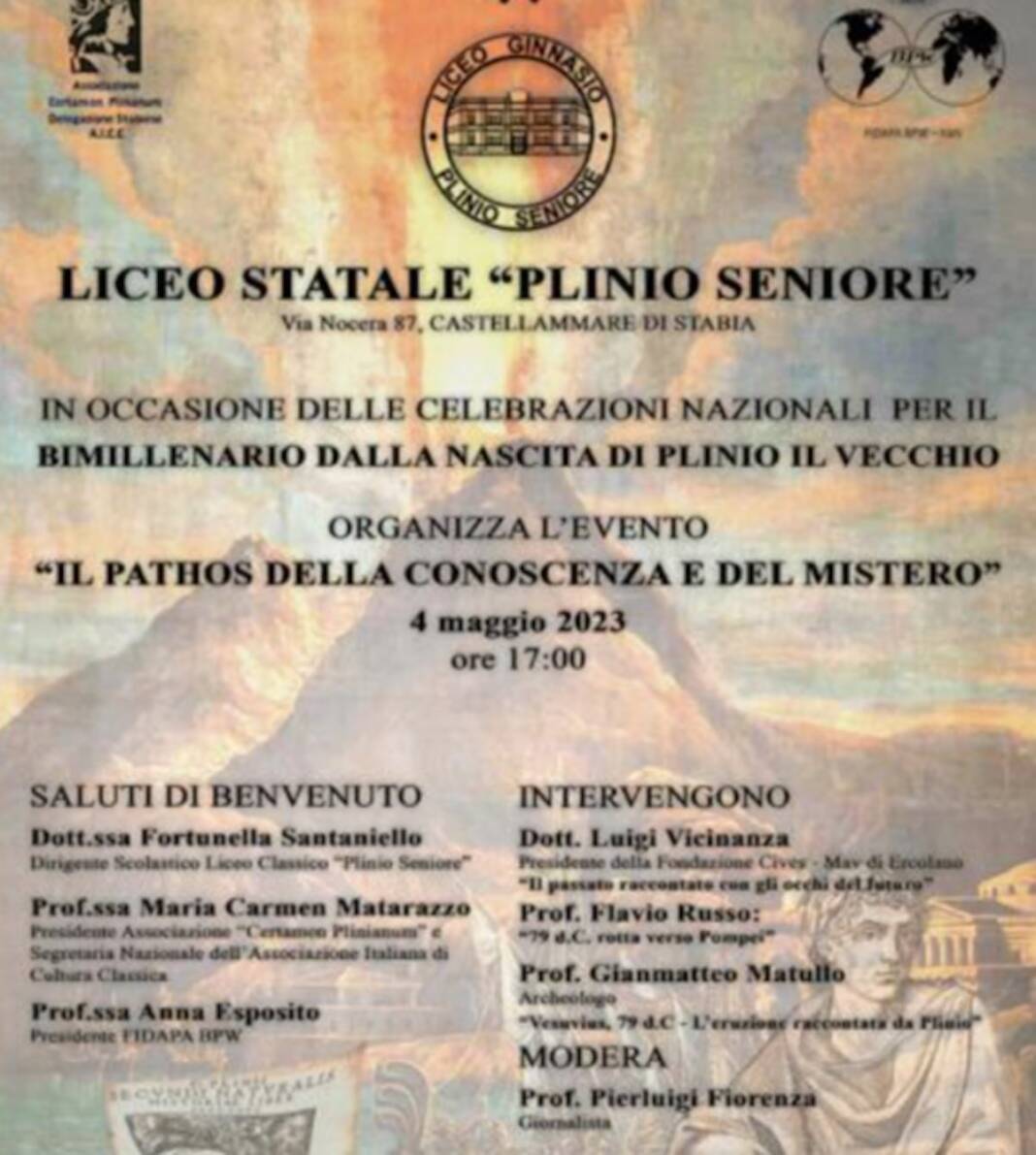 In occasione del bimillenario della nascita di Plinio il Vecchio, il Liceo Classico “Plinio Seniore” di Castellammare di Stabia, che al grande naturalista fu intitolato sin dalla sua istituzione nel 1918, si associa alle celebrazioni che si stanno programmando in tutta Italia, organizzando, il giorno 4 maggio, presso l’ Aula Magna dell’Istituto, l’evento “Il pathos della conoscenza e del mistero”.