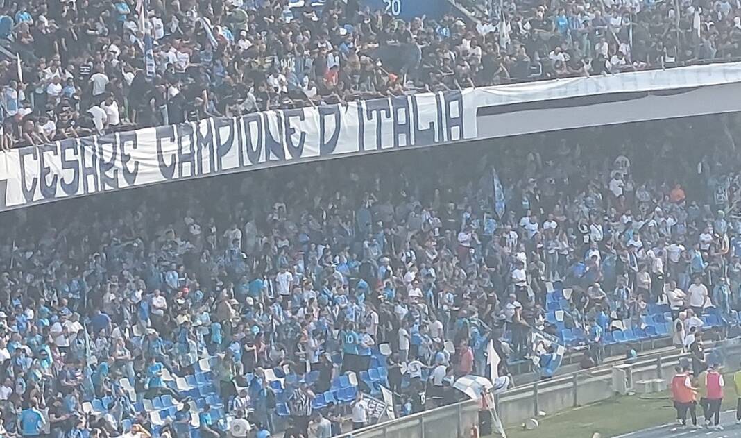 Oggi, dopo che i partenopei si sono finalmente laureati campioni d’Italia, Cesare c’è ancora e ha chiamato prontamente Carlo Alvino, urlando tutta la sua felicità per il trionfo arrivato dopo la serata di Udine.E la curva ci ha tenuto ad omaggiarlo con uno striscione, comparso nel pre-partita di Napoli-Fiorentina: “Cesare campione d’Italia”.