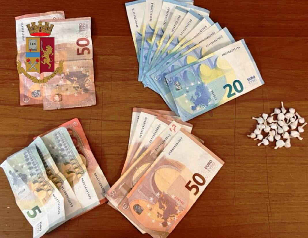 Inoltre, i poliziotti lo hanno trovato in possesso di altri 28 involucri contenenti cocaina per un peso complessivo di circa 4,6 grammi e di 555 euro accertando, altresì, che due banconote risultavano false.