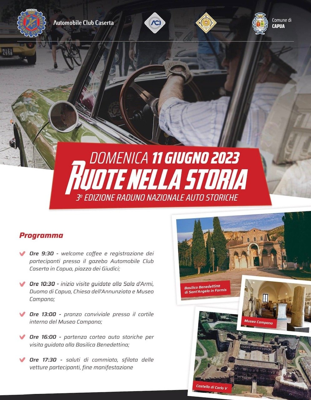 Organizzato dall’Automobile Club Caserta e Aci Storico in collaborazione con il Comune di Capua, l’evento si svolgerà presso la Basilica Benedettina di Sant’Angelo in Formis e il Museo Campano, con visite guidate alla Sala d’Armi, al Duomo di Capua, alla Chiesa dell’Annunziata. La manifestazione, inoltre, prevede anche un pranzo conviviale nel cortile interno del Museo Campano.