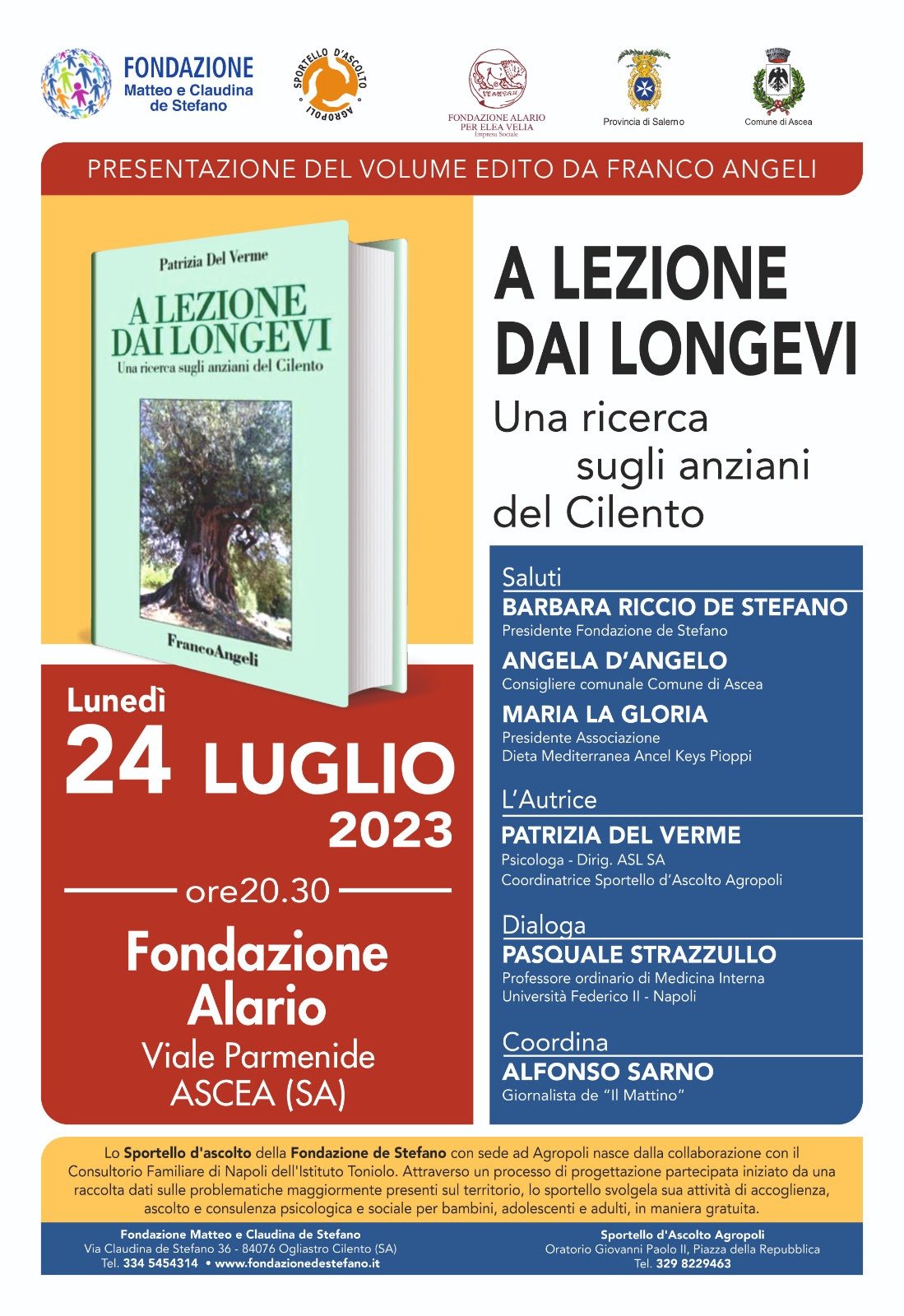 Dopo gli importanti appuntamenti di Napoli, Salerno e Roma, non poteva mancare la tappa in Cilento. Sarà la Fondazione Alario di Ascea ad accogliere il prossimo lunedì 24 luglio, alle 20.30, la Fondazione Matteo e Claudina de Stefano di Ogliastro Cilento per la presentazione del volume “A lezione dai longevi. Una ricerca sugli anziani del Cilento” (Edizioni Franco Angeli).