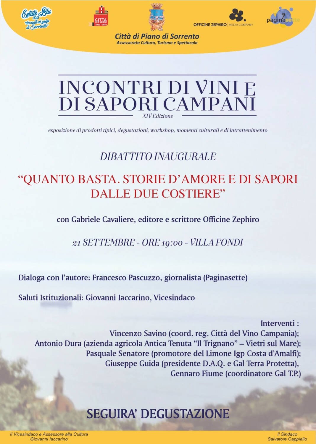 Si parte con il dibattito “Quanto basta. Storie d’amore e di sapori dalle due costiere”. Dialogo con Gabriele Cavaliere , editore e scrittore, a cura di Francesco Pascuzzo, giornalista (PaginaSette). Dopo i saluti istituzionali del vicesindaco, Giovanni Iaccarino, interventi di Vincenzo Savino (coordinatore regionale Città del Vino Campania); Antonio Dura (azienda agricola Antica Tenuta “Il Trignano” – Vietri sul Mare); Pasquale Senatore (promotore del Limone Igp Costa d’Amalfi); Giuseppe Guida (presidente D.A.Q. e Gal Terra Protetta) e Gennaro Fiume (coordinatore Gal Terra Protetta). A seguire inizio di assaggi dei prodotti in mostra con focus sulla Costiera Amalfitana. Dalle ore 20 verranno aperti gli stand enogastronomici con vino, salumi, formaggi, agrumi e tanto altro.