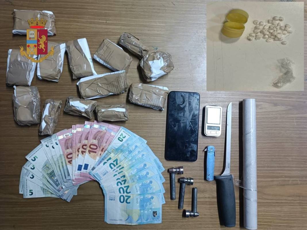 Inoltre, gli operatori, con il supporto delle volanti dell’Ufficio Prevenzione Generale e Soccorso Pubblico, hanno effettuato un controllo nell’alloggio in cui hanno rinvenuto complessivamente 40 involucri contenenti circa 7grammi di cocaina, un bilancino di precisione, diverso materiale per il confezionamento della droga, un coltello, un cellulare e 550 euro.