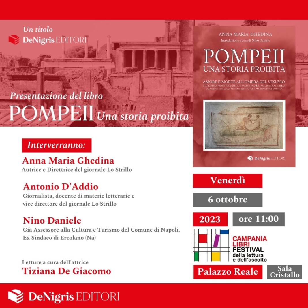 Grande successo e pubblico delle occasioni importanti per la presentazione del nuovo libro di Annamaria Ghedina, Pompei, una storia proibita. Amore e Morte all’ombra del Vesuvio, DeNigris Editore, che si è tenuta, nell’ambito del Campania Libri Festival, al Palazzo Reale, nella Sala Cristallo.