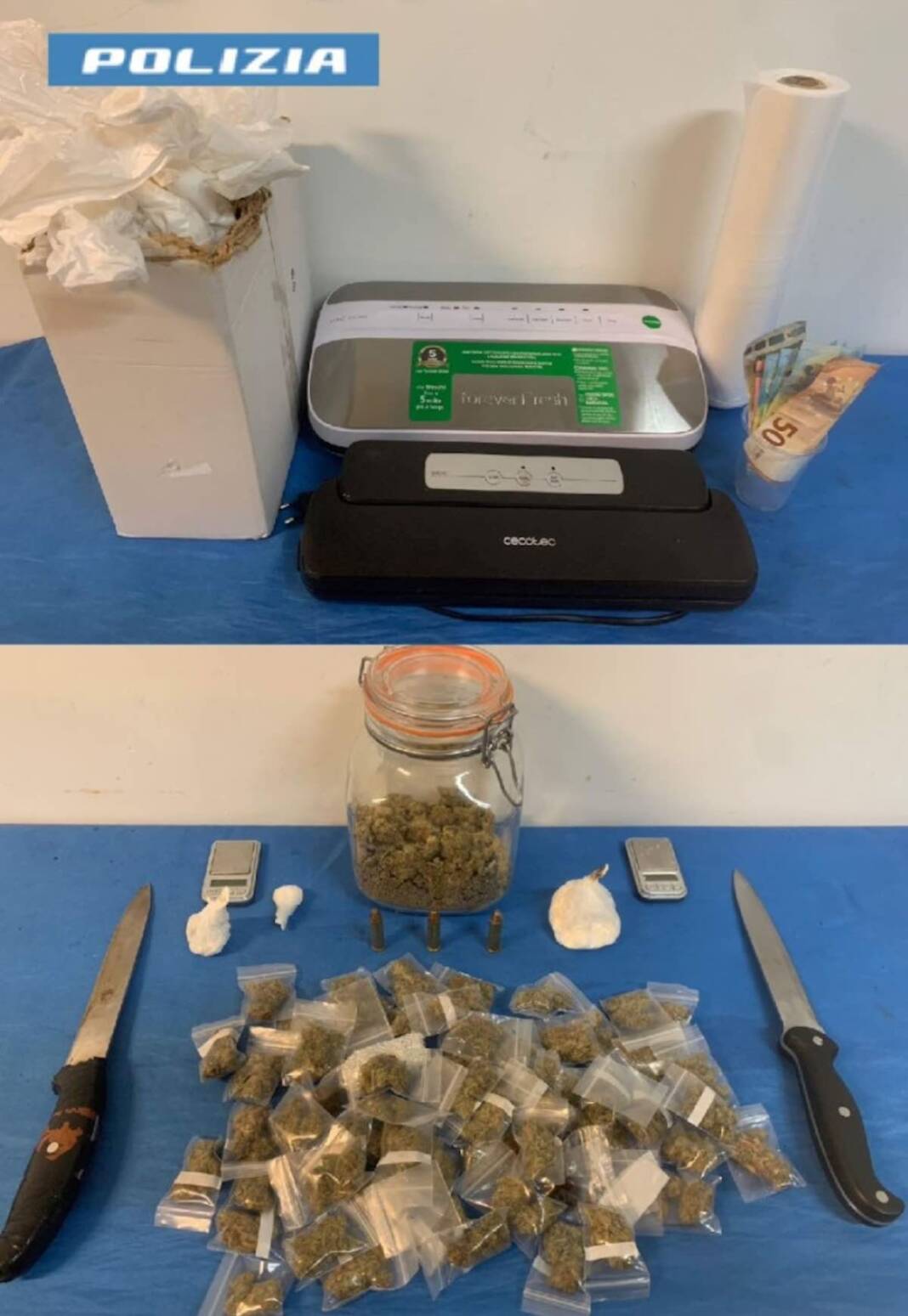 L’intuito investigativo si è rivelato positivo, e una volta entrati nell’appartamento, i poliziotti hanno sorpreso e bloccato sette uomini seduti al tavolo della cucina, dove sono stati rinvenuti 1 panetto di hashish (circa 24 grammi), 4 involucri di hashish (circa 13 grammi), 2 involucri di cocaina (circa 31 grammi), 1 involucro di marijuana (circa 98 grammi), 57 dosi di marijuana (circa 69 grammi), 85 euro in contanti, materiale per il confezionamento della droga, 2 bilancini di precisione, un paio di forbici e 2 coltelli contaminati con sostanze stupefacenti. Inoltre, sono state trovate 3 cartucce calibro 357 magnum e 2 macchine per il sottovuoto.