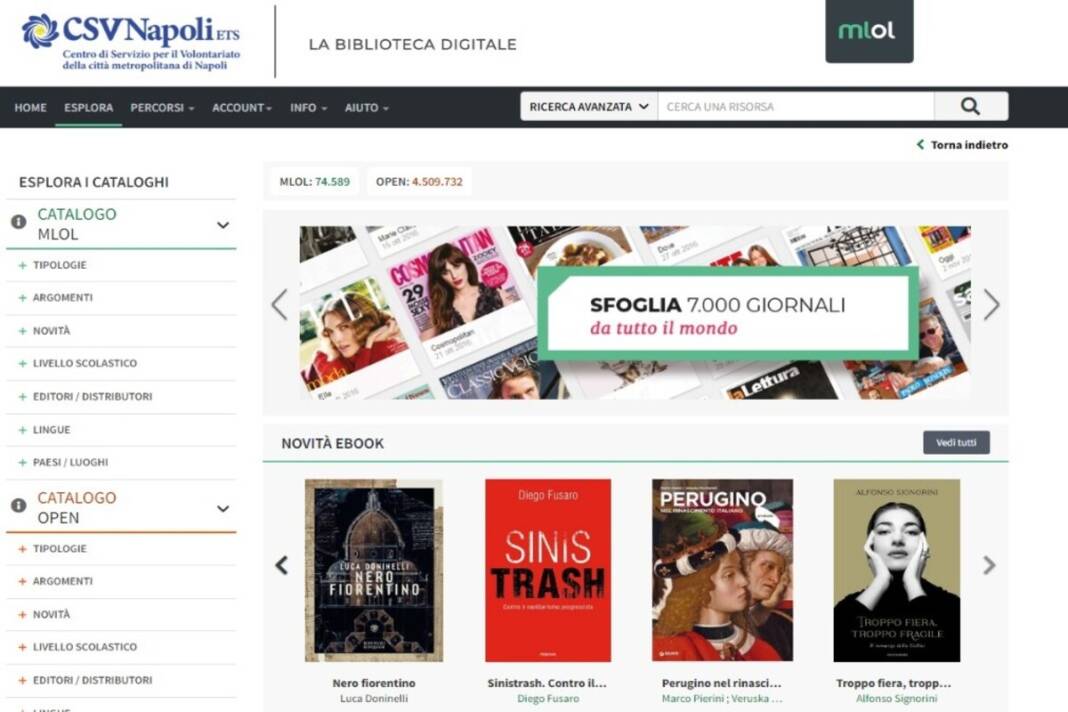 Questo è MyLibrary, la biblioteca digitale di CSV Napoli che aderisce a MediaLibraryOnLine (MLOL), la prima rete italiana di biblioteche pubbliche per il prestito digitale, disponibile in oltre 7000 biblioteche di tutte le Regioni italiane e 12 Paesi stranieri.