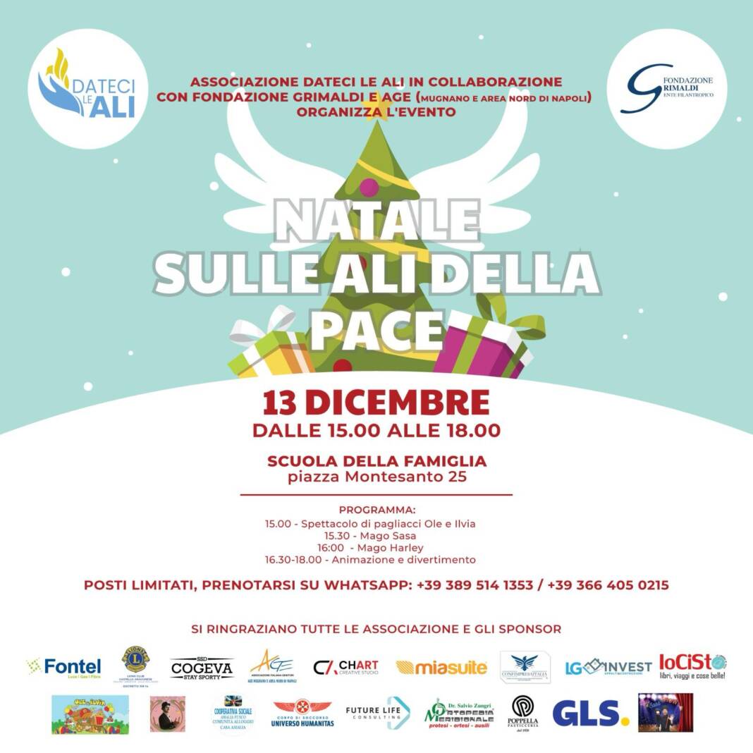 Mercoledì 13 dicembre, dalle 15 alle 18, presso la Scuola della famiglia in piazza Montesanto 25, si svolgerà l’evento “Natale sulle Ali della Pace”.
