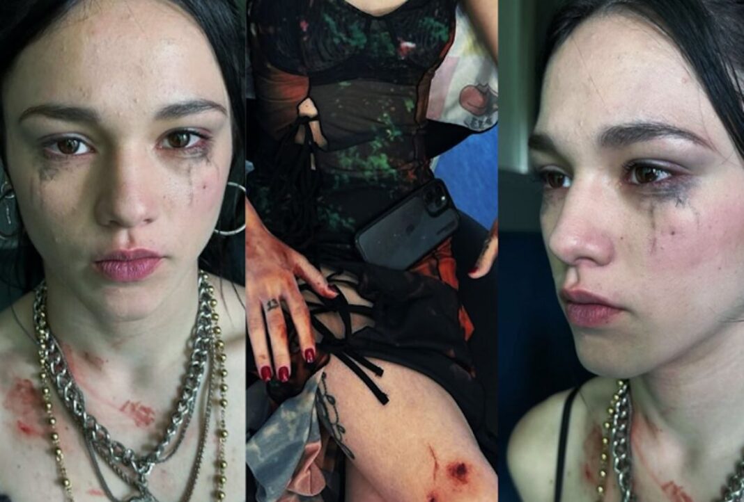 Le immagini raffigurano Rosa Ricci ferita e sporca di sangue, e con il trucco sciolto dal pianto.