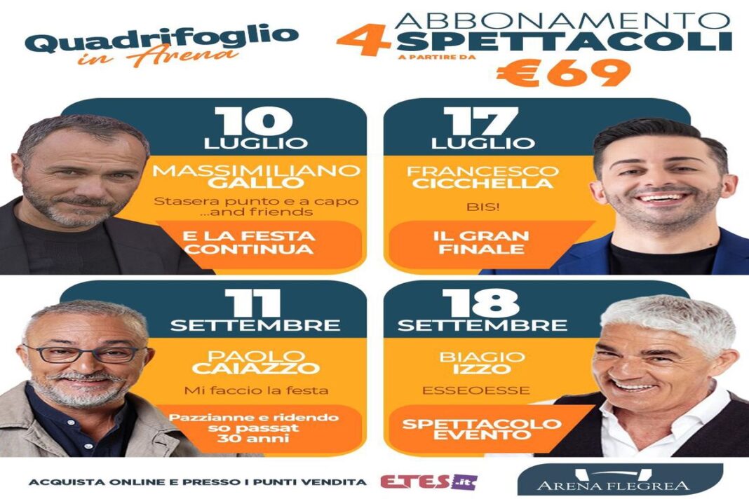 Per la prima volta, l’Arena Flegrea lancia una campagna abbonamenti che permetterà al pubblico di assistere a tutti e quattro gli spettacoli ad un prezzo vantaggioso, a partire da soli 69 euro. Questa iniziativa offre un’esperienza teatrale estiva indimenticabile, ricca di energia positiva e divertimento. La combinazione di talento, emozioni e teatro all’aperto renderà ogni serata di Quadrifoglio in Arena un momento unico e speciale.