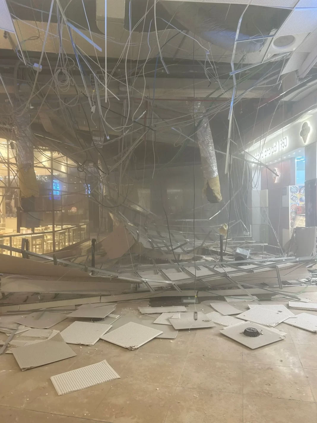 Poteva essere una strage, per fortuna solo tanta paura al Centro Commerciale Campania di Marcianise. Verso le 22 e’ crollato una parte del contro soffitto del primo piano, nella zona centrale denominata piazza Campania, vicino al negozio di gelati “La scimmietta” al piano terra.