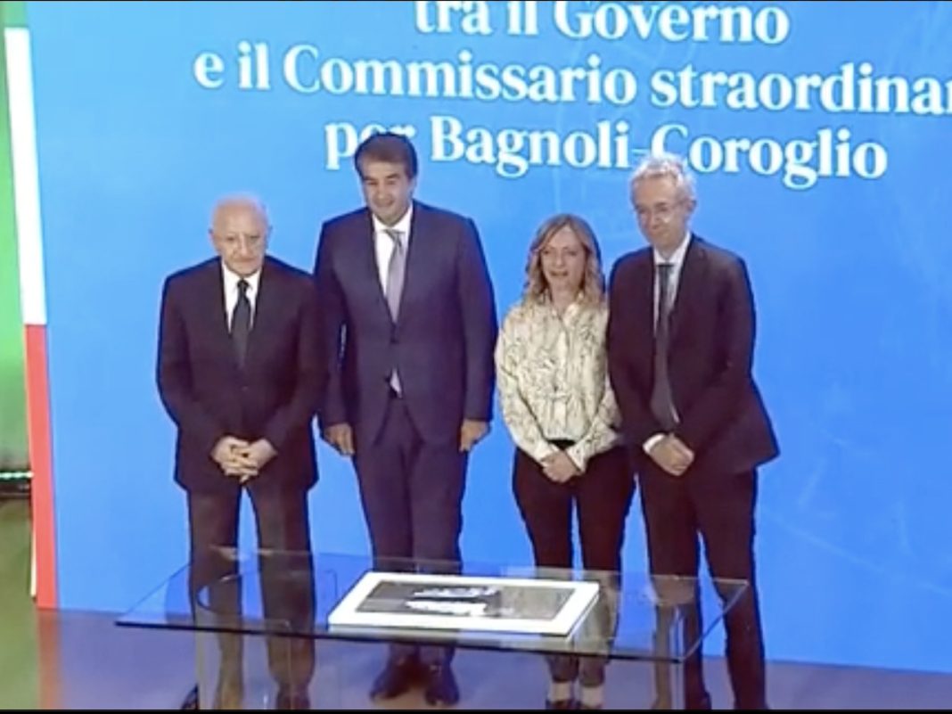 La Presidente del Consiglio, Giorgia Meloni, ha definito il progetto “l’opera di risanamento ambientale e di rigenerazione urbana più ambiziosa d’Europa” durante il suo discorso. Presenti in prima fila anche il Presidente della Regione Campania, Vincenzo De Luca, e altri esponenti istituzionali.