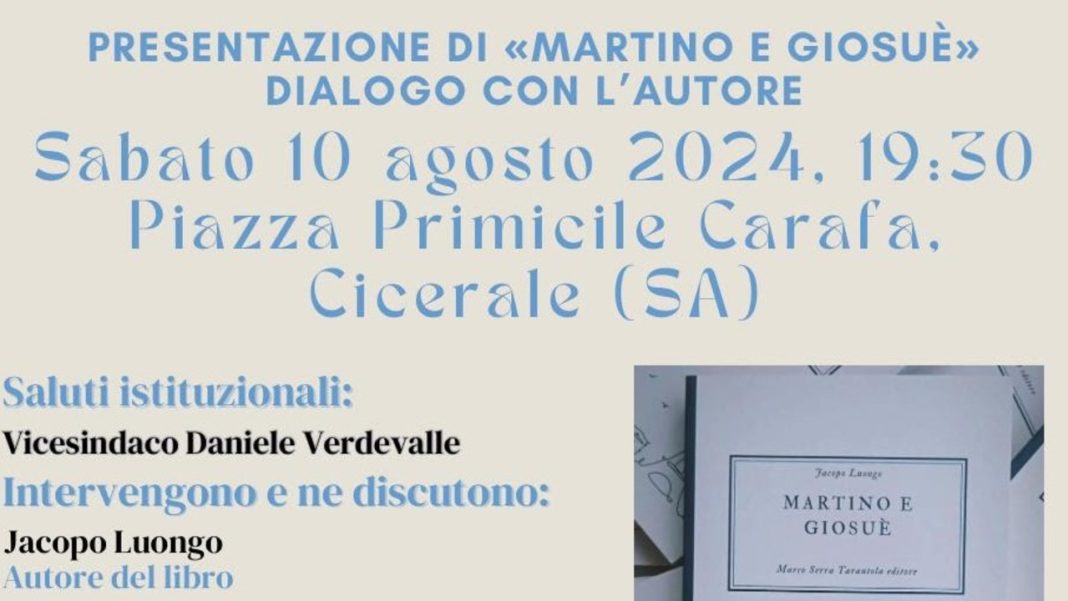 Sabato 10 agosto alle 19:30, la suggestiva piazza Primicile Carafa di Cicerale (SA) ospiterà la presentazione del libro “Martino e Giosuè” di Jacopo Luongo, un giovane autore cilentano. L’evento vedrà la partecipazione, oltre che dell’autore, di autorevoli figure del panorama culturale come la professoressa Maria Rosa Valente, il dottore in lettere moderne Rosario Papa e l’assessora alla cultura Chiara Valva.
