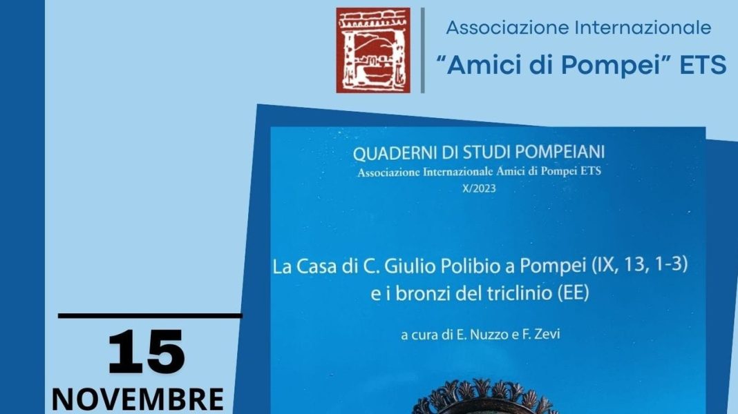 Nel prestigioso contesto dell’Auditorium degli Scavi di Pompei, il 15 novembre 2024, alle ore 17, verrà presentato il nuovo volume della collana “Quaderni di Studi Pompeiani”, edita dall’Associazione Internazionale “Amici di Pompei” ETS. L’opera s’intitola “La Casa di C. Giulio Polibio a Pompei (IX, 13, 1-3) e i bronzi del triclinio (EE)” ed è stata redatta dagli archeologi Fausto Zevi ed Elsa Nuzzo.