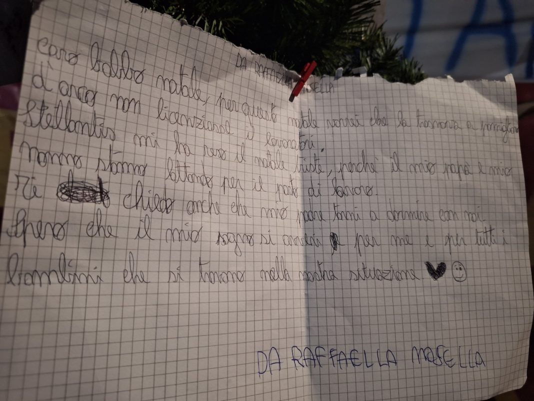 La letterina che è stata posta sull’albero di Natale fuori ai cancelli di Stellantis è firmata da Raffaella Mosella, la figlia e nipote di due dei tanti lavoratori Trasnova di Pomigliano che ieri hanno ricevuto le lettere di licenziamento e che da alcuni giorni sono fuori dai cancelli dello stabilimento a protestare bloccando la produzione della fabbrica.