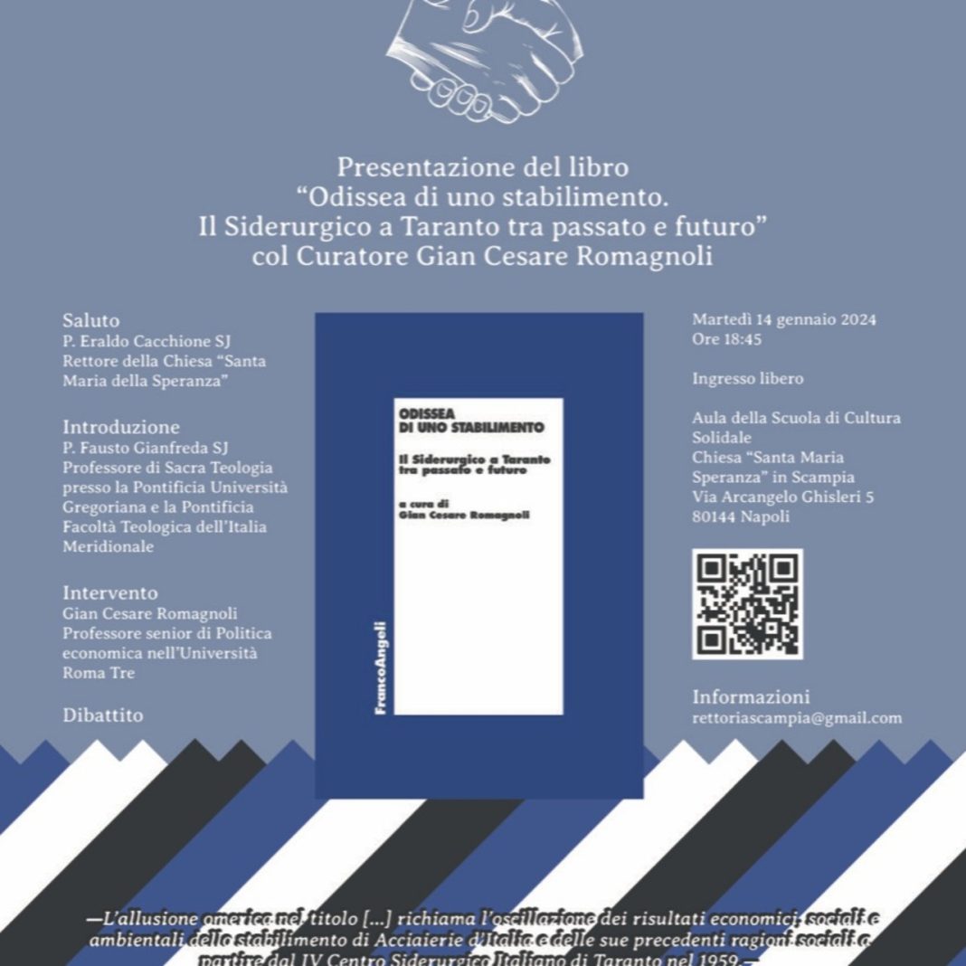 L’appuntamento del 14 gennaio alle ore 18:45 nella chiesa Santa Maria della Speranza vedrà la partecipazione di Gian Cesare Romagnoli, Professore senior di Politica Economica presso l’Università Roma Tre. Il libro in presentazione è “Odissea di uno stabilimento. Il Siderurgico a Taranto tra passato e futuro”, edito da Franco Angeli e curato dallo stesso Romagnoli. La pubblicazione include saggi di vari esperti, tra cui politici, ambientalisti, sindacalisti, economisti, ingegneri e sociologi, che discutono l’impatto economico, sociale e ambientale dello stabilimento siderurgico di Taranto.