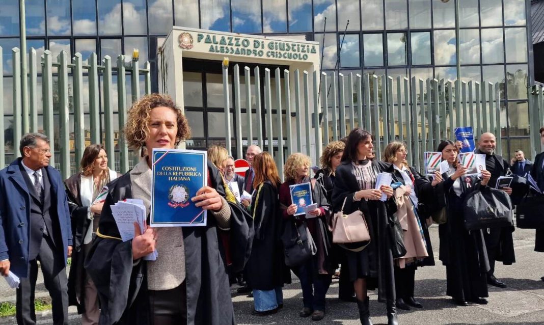 Toga sulle spalle, coccarda tricolore in petto e in mano un volantino della Costituzione italiana. A Napoli i magistrati hanno risposto presente allo sciopero, su base nazionale, indetto dall’Associazione nazionale magistrati contro il progetto di riforma della separazione delle carriere, dello sdoppiamento del Csm con introduzione del sorteggio come metodo elettivo, e dell’istituzione dell’Alta Corte disciplinare.