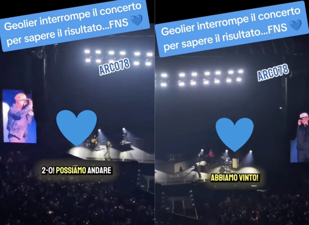 Durante il suo terzo concerto al Palazzetto dello Sport di Roma il rapper napoletano si è esibito in contemporanea alla partita tra Napoli e Milan allo stadio Maradona. Ad un certo punto Geolier, come mostra il video allegato pubblicato da un suo fan pure lui tifoso azzurro, si è fermato e ha chiesto: “Guagliù tutto appost. Il Napoli a quanto sta?”.