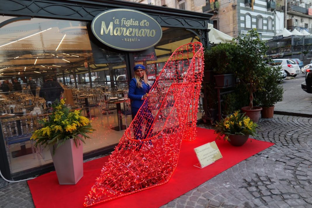 Davanti al locale di via Foria, è stata installata una gigantesca scarpa rossa, alta oltre due metri, ispirata alle “scarpette rosse” dell’artista messicana Elina Chauvet, divenute un potente simbolo contro la violenza di genere e il femminicidio.