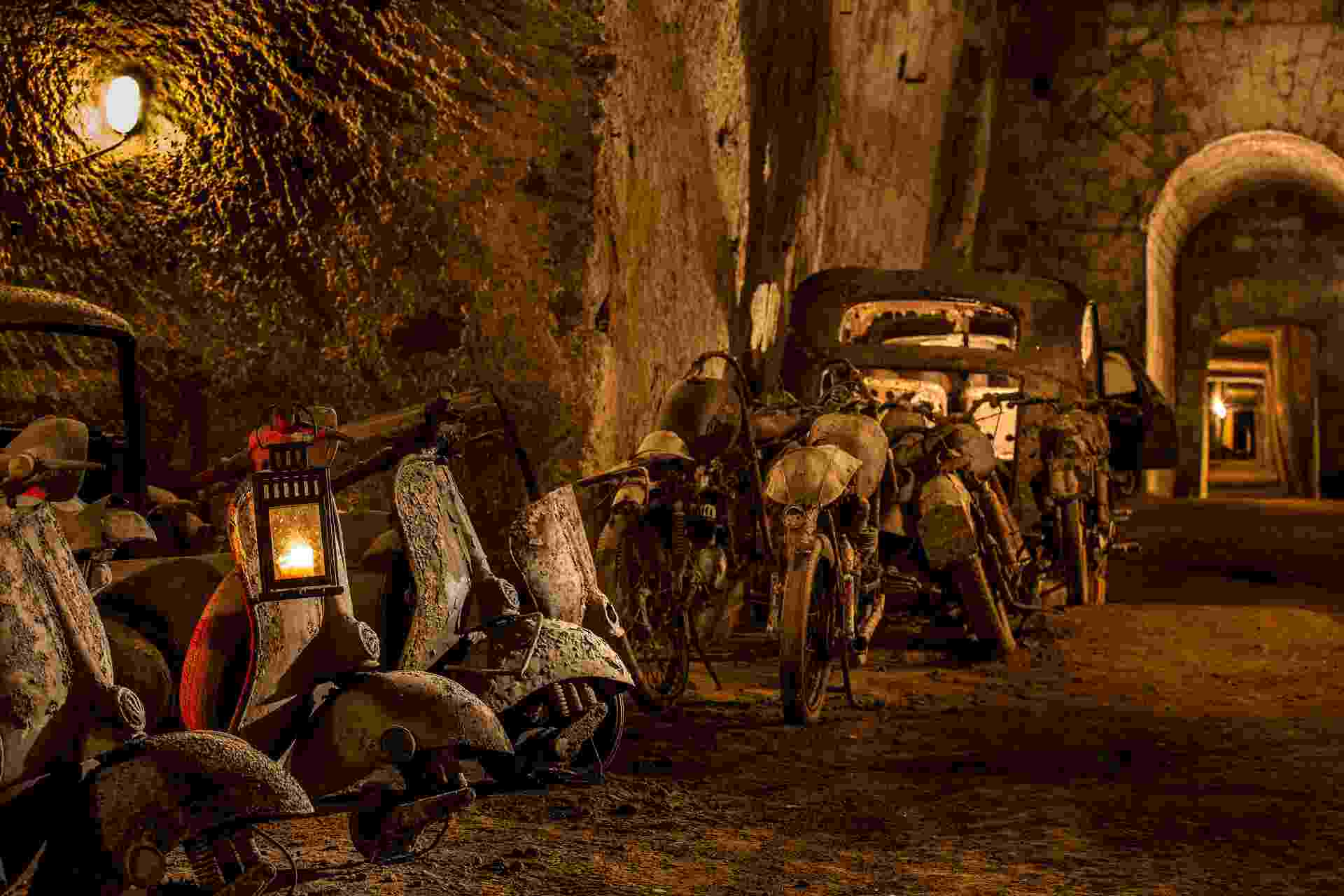 Camminando tra i corridoi illuminati da luci soffuse, ti imbatterai in reperti unici: vecchie auto e moto d’epoca abbandonate, graffiti di epoche lontane, cisterne d’acqua scavate nel tufo e persino resti di statue classiche. Ogni angolo è una sorpresa, un frammento di Napoli che non troverai in nessuna guida turistica tradizionale.