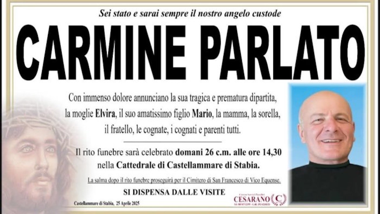 Parlato, originario di Vico Equense ma residente a Castellammare di Stabia, sarà commemorato alle 14.30 nella Cattedrale di Castellammare. Al termine della cerimonia, la salma verrà trasferita al cimitero di San Francesco a Vico Equense, dove riposerà accanto ai suoi cari.