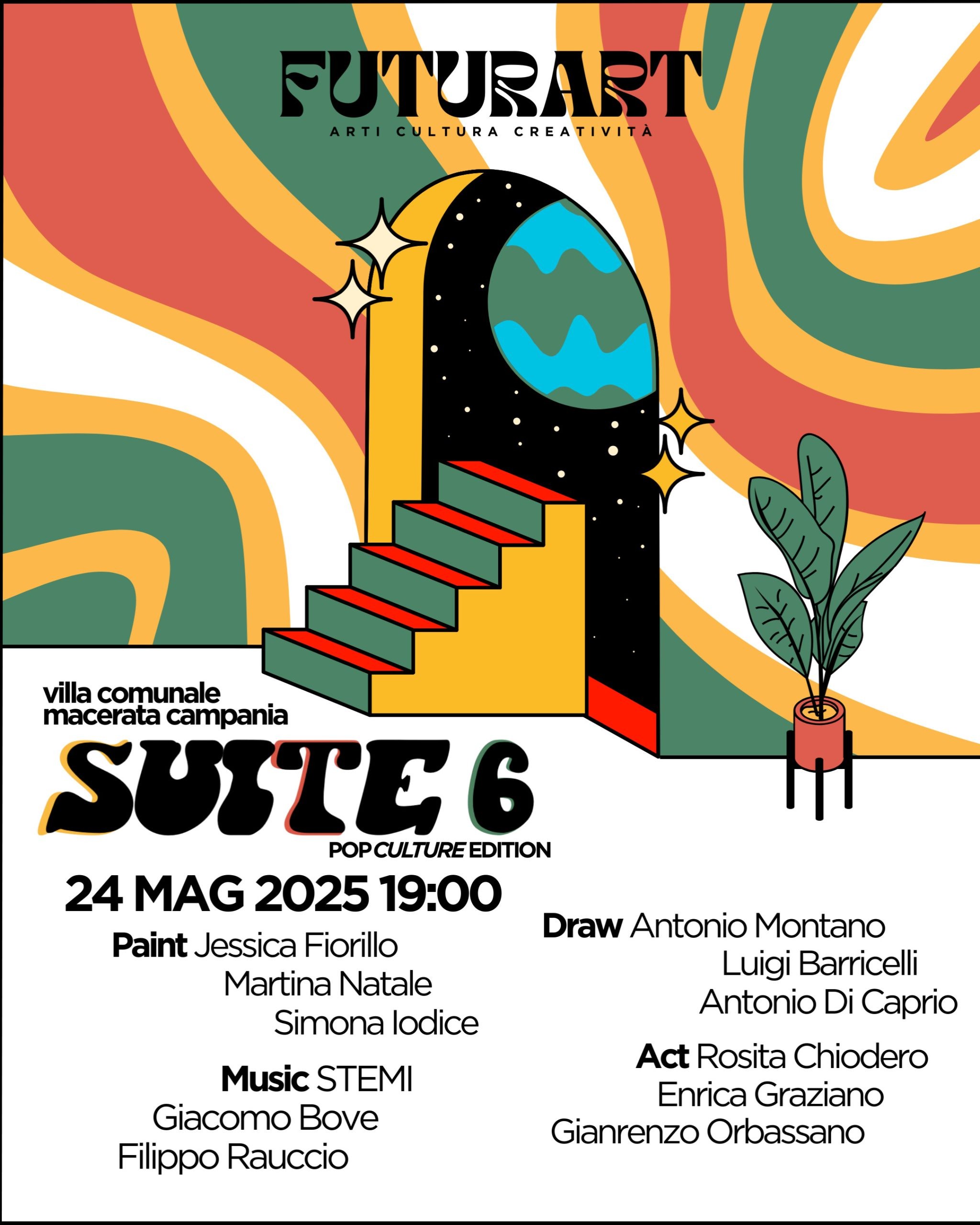 Sabato 24 maggio, dalle ore 19:00, la Villa Comunale di Macerata Campania si trasformerà in un crocevia creativo grazie a ‘Suite 6 – Pop Culture Edition’, il nuovo evento culturale firmato dall’associazione FuturArt.
