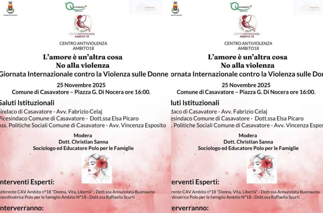 Il 25 novembre 2025, alle ore 16:00 in Piazza G. Di Nocera, si terrà un importante evento in occasione della Giornata Internazionale contro la Violenza sulle Donne, organizzato dall’Ufficio Politiche Sociali del Comune di Casavatore.