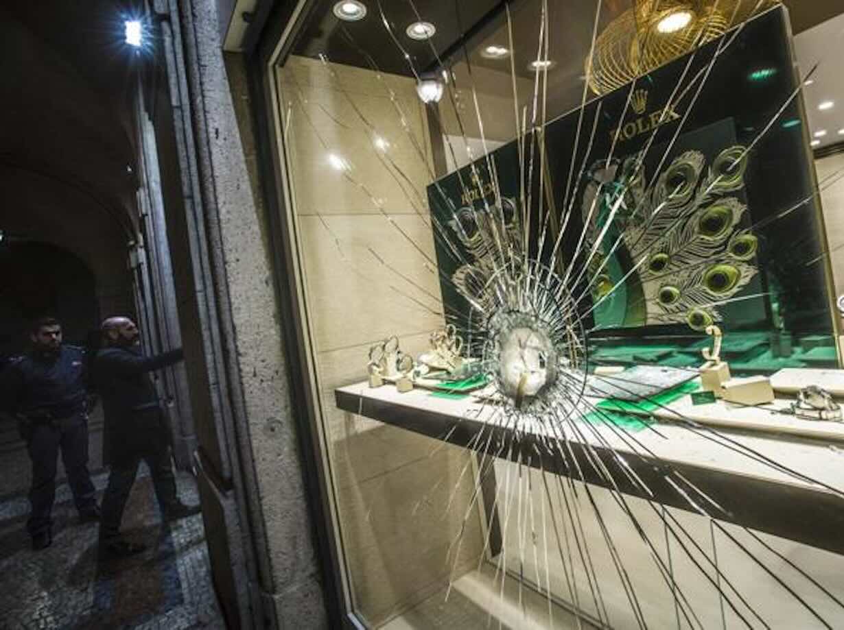Armato di una pesante mazza ferrata, ha iniziato a colpire ripetutamente la vetrina espositiva, incurante del passaggio o delle telecamere di sorveglianza. L’intento era chiaro: creare una breccia nel vetro antisfondamento per arraffare i preziosi esposti e fuggire.