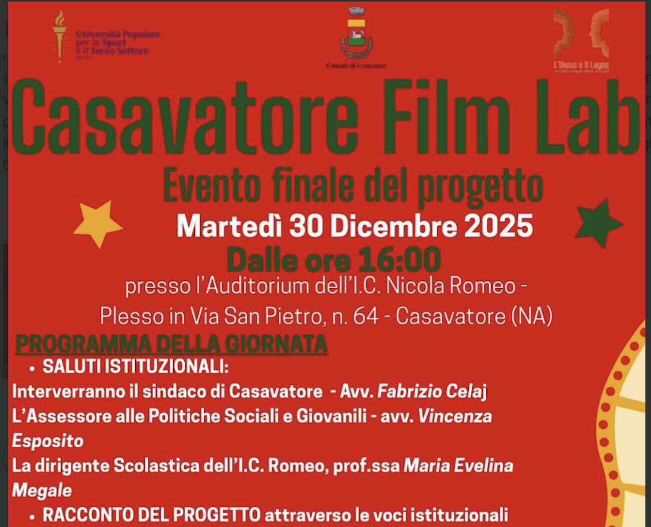 Casavatore – Si terrà domani, martedì 30 dicembre, alle 16.00 presso l’auditorium dell’Istituto Comprensivo “Nicola Romeo” di Casavatore – sito in via San Pietro – l’evento finale del progetto “Casavatore FilmLab – Educazione e Cinema per Crescere Insieme”.