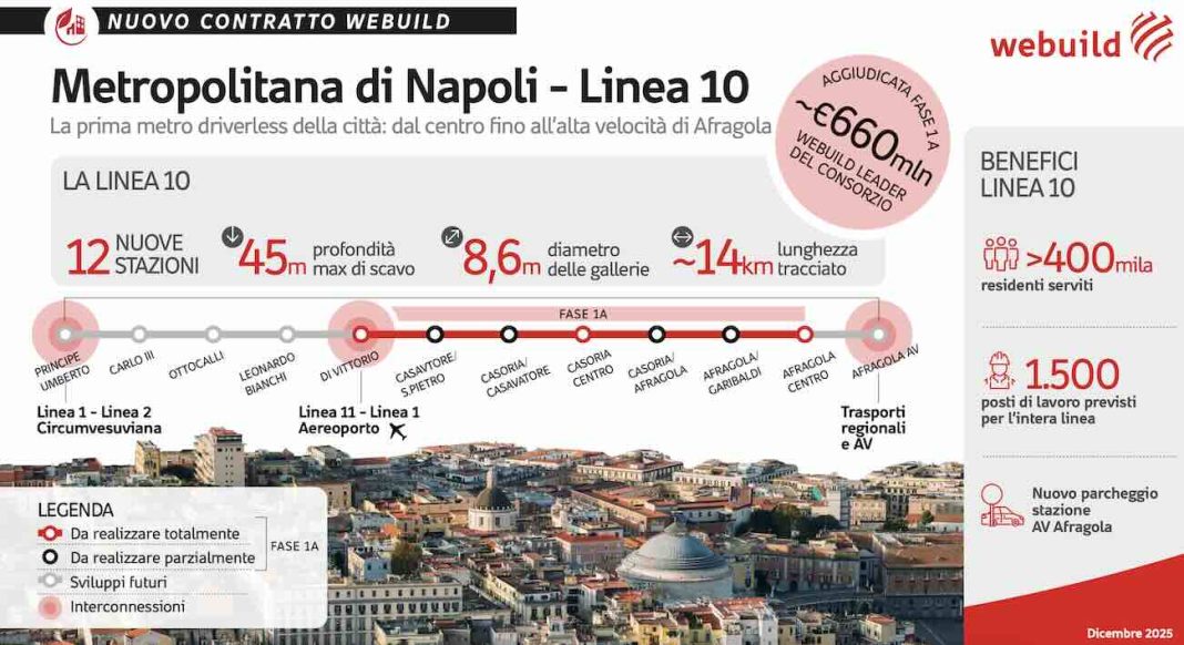Il progetto della Linea 10 è sviluppato in sinergia tra Comune di Napoli e Regione Campania, con EAV nel ruolo di soggetto attuatore, ed è considerato una delle opere più strategiche per la mobilità sostenibile del Mezzogiorno. Il collegamento con la stazione AV Napoli-Afragola – già realizzata da Webuild – rafforzerà il ruolo dell’hub come nodo chiave tra il sistema ferroviario regionale e la rete nazionale ad alta velocità.