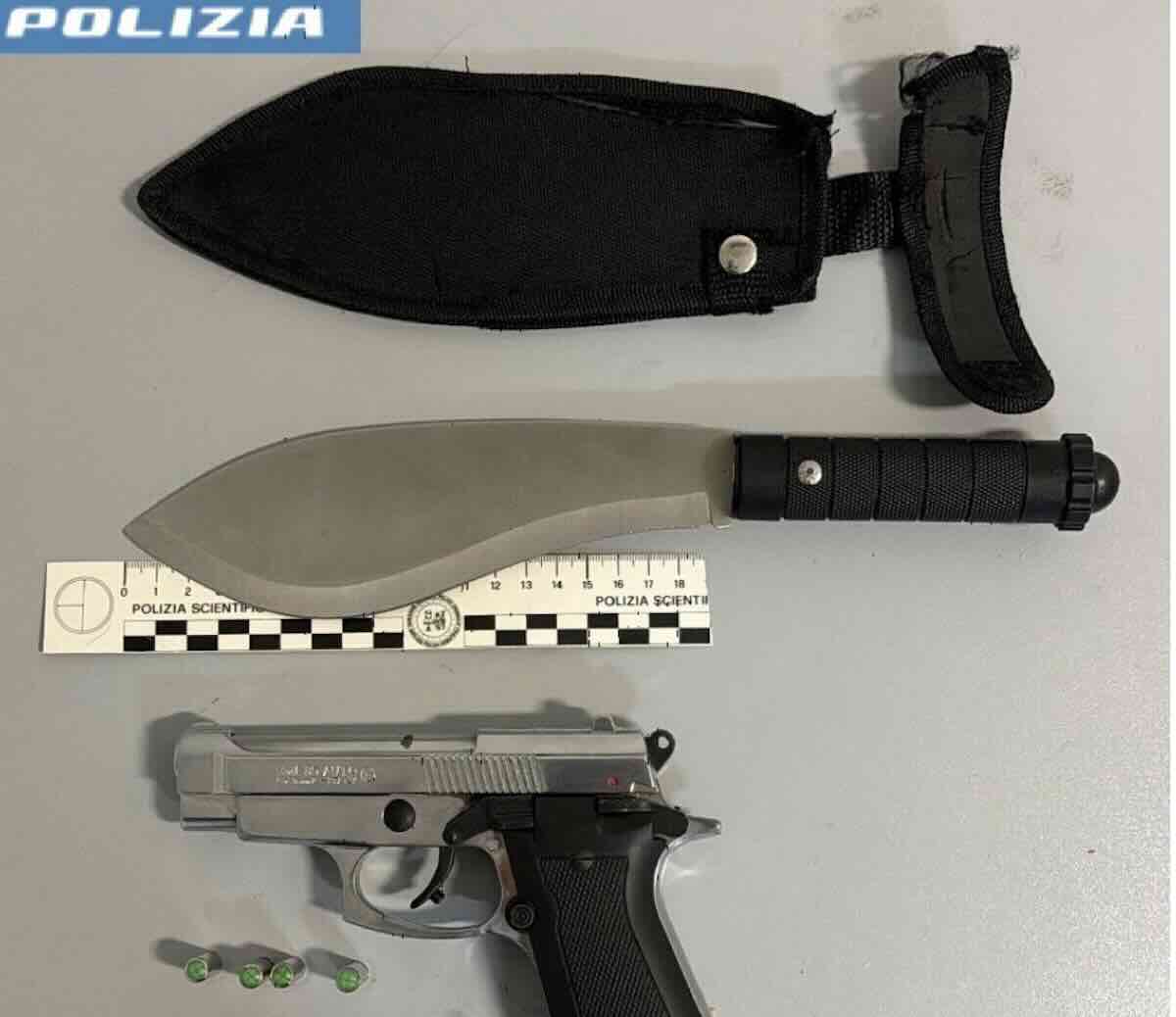 La perquisizione ha rivelato la gravità della situazione. Il ragazzo era infatti in possesso di una pistola replica calibro 8, resa pericolosamente realistica dall’assenza del tappo rosso e dal caricatore caricato con 4 cartucce a salve. Gli agenti hanno poi recuperato il machete, risultato essere di chiara foggia militare, gettato durante la fuga.