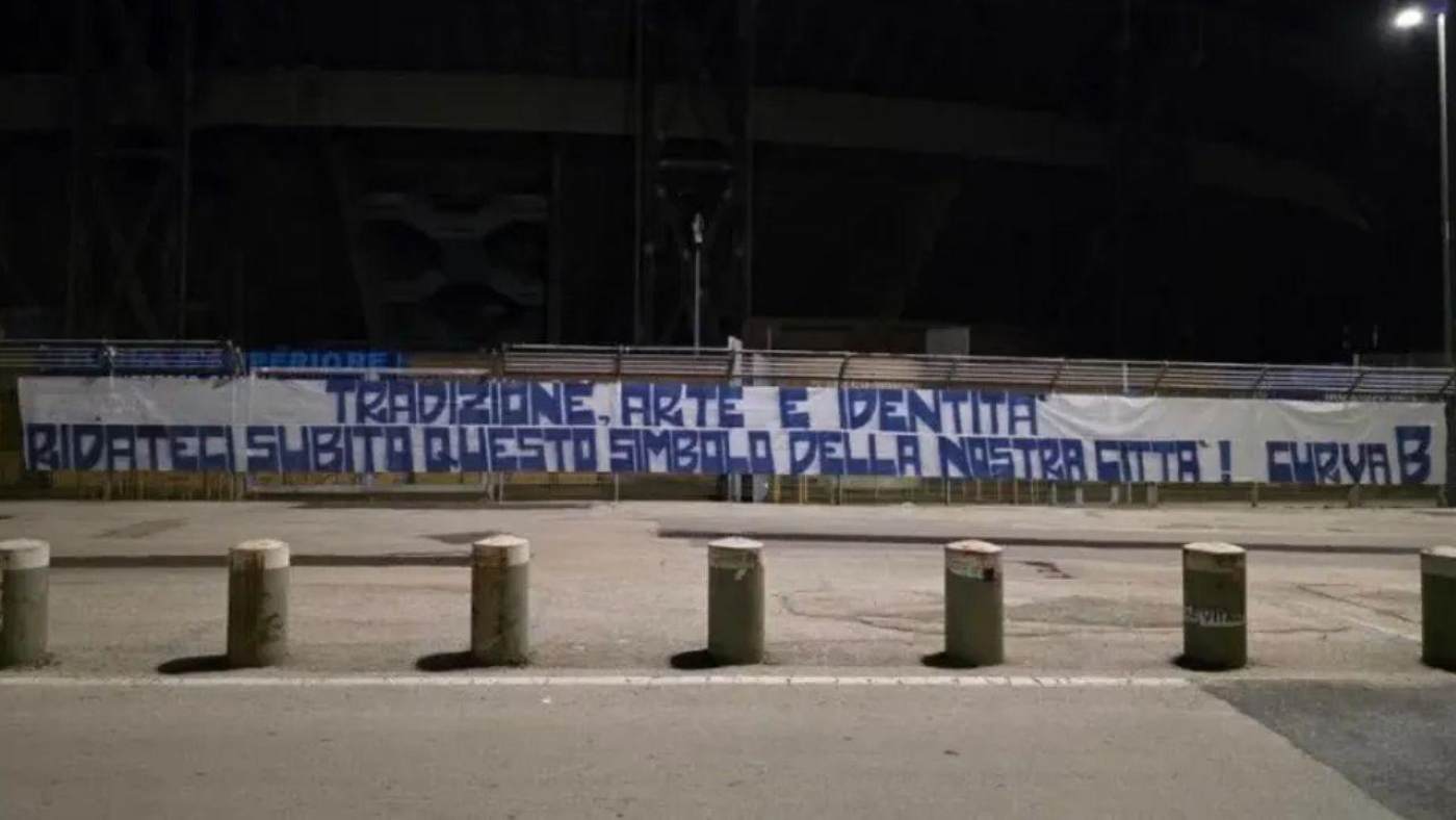 All’esterno dello Stadio Diego Armando Maradona, i gruppi della Curva B hanno esposto uno striscione che va oltre il calcio e diventa dichiarazione d’identità: “Tradizione, arte e identità. Ridateci subito questo simbolo della nostra città”. Parole secche, dirette, che raccontano quanto il Sannazaro sia percepito come patrimonio collettivo, non come semplice luogo di spettacolo.