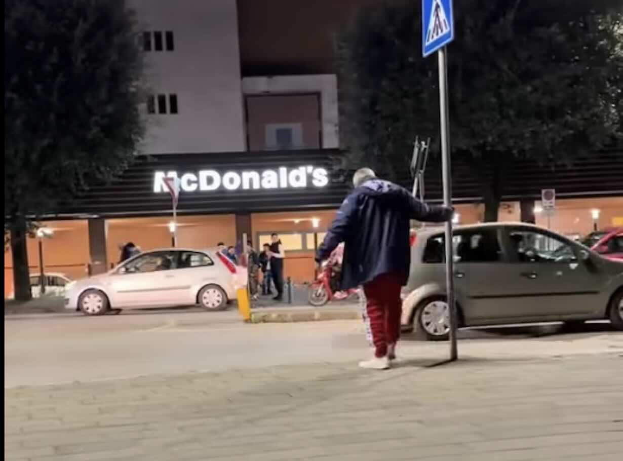 La scena si svolge nei pressi di un noto centro commerciale. Mentre la vita cittadina scorre tra auto e passanti, il “branco” dei giovanissimi punta la vittima. L’uomo cammina a fatica, non è lucido, forse è malato o sotto l’effetto di sostanze. Ma per i piccoli aguzzini è solo un bersaglio.