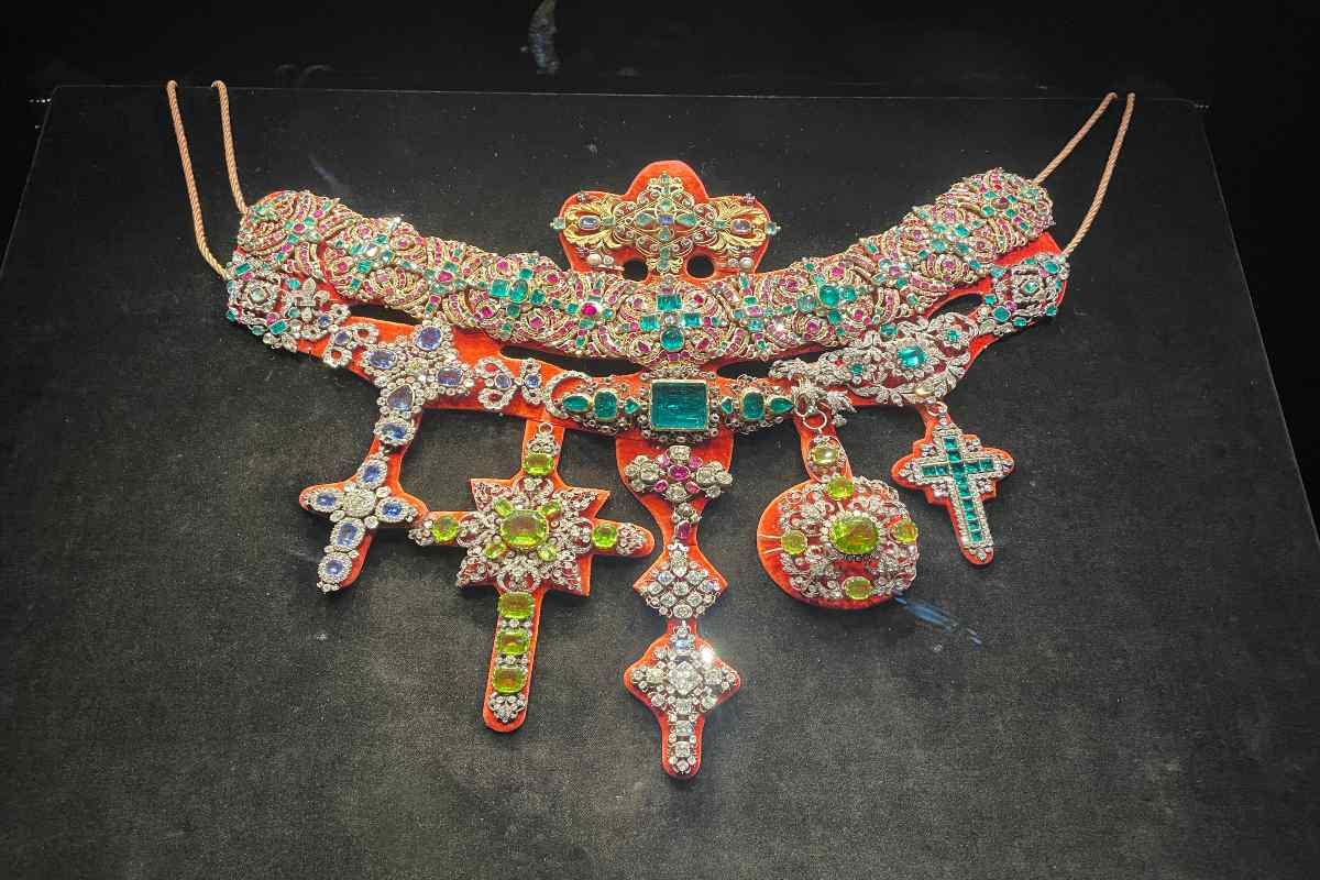 • La mitra gemmata di San Gennaro, con quasi 4.000 pietre preziose (diamanti, smeraldi, rubini) che ne fanno uno degli oggetti più sfarzosi al mondo.