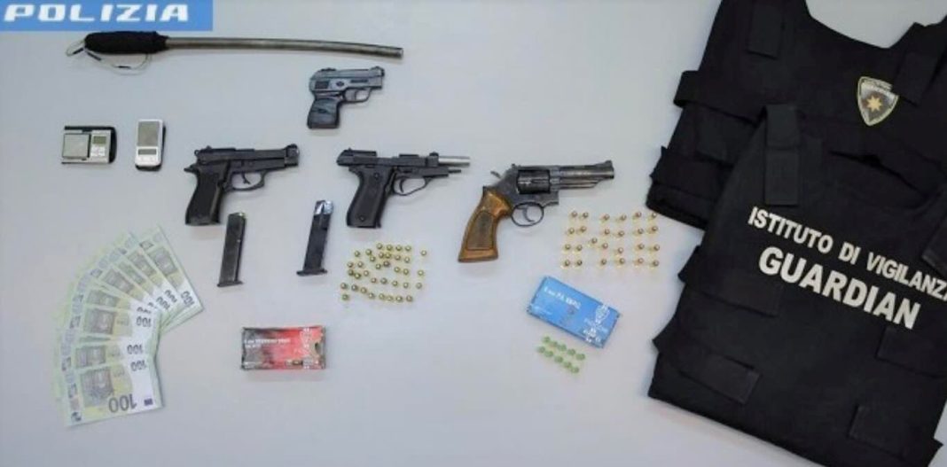Nel corso dei controlli gli investigatori hanno sequestrato quattro pistole. Tra queste un revolver calibro .357 Magnum con matricola abrasa, una pistola semiautomatica calibro .22 e due pistole a salve, repliche rispettivamente della Beretta 85 FS e della Beretta 84, entrambe modificate e rese idonee allo sparo.
