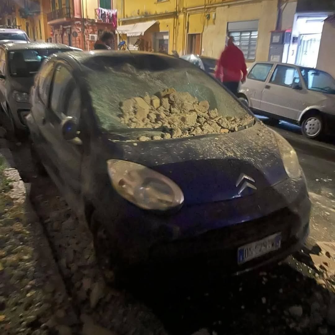 Crollo insegna a Casapulla, palazzo bloccato e auto distrutte